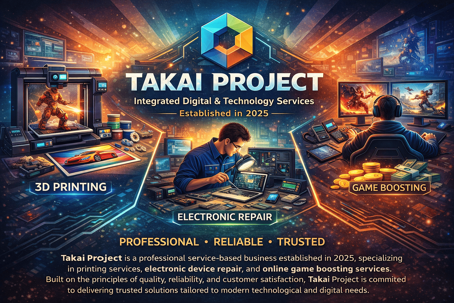 We are a dedicated team committed to providing innovation in printing, electronic repairs, and online gaming support since 2025.